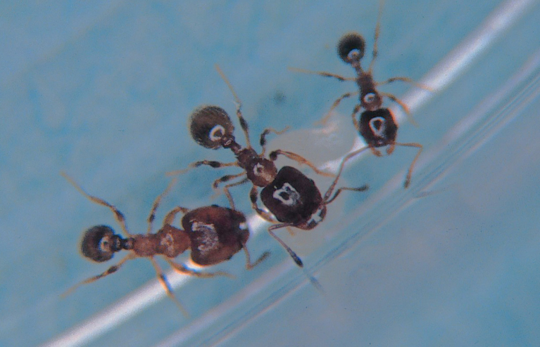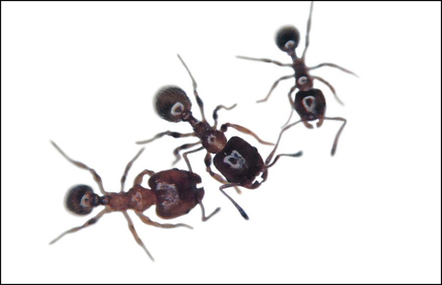 Background removed from a photo of three Pheidole bicarinata ants.